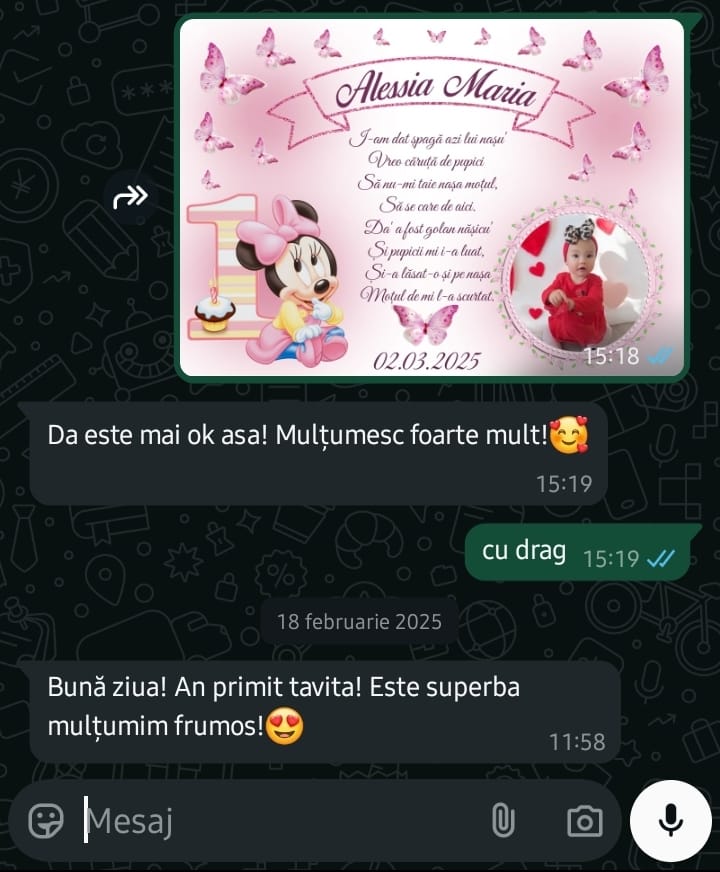 Da, oferim simulări digitale pentru comenzile personalizate! După ce plasezi comanda și ne trimiți detaliile (numele copilului, tematica, culorile etc.), îți trimitem pe WhatsApp sau email o simulare cu designul final pentru confirmare, înainte de a începe producția.